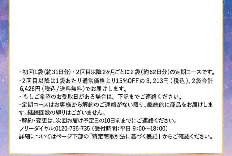 03. お客様は、定期コースの内容変更(商品や個数、お届け間隔の変更、お届け日の前倒しまたは延期等)、定期コースの解約等の手続きをする場合には、お届け予定日の10日前までに当社フリーダイヤル0120-735-735(9:00~18:00受付 ※土日祝・年末年始・夏季休業期間を除く)、メールアドレス(メールアドレス)または問い合わせフォームまで連絡していただく必要があります。10日前までに連絡いただけない場合は、定期便の内容変更、解約等を承ることができないことがあります。その場合に、お客様に不利益や損害が発生したとしても、当社は一切の責任を負わないものとします。